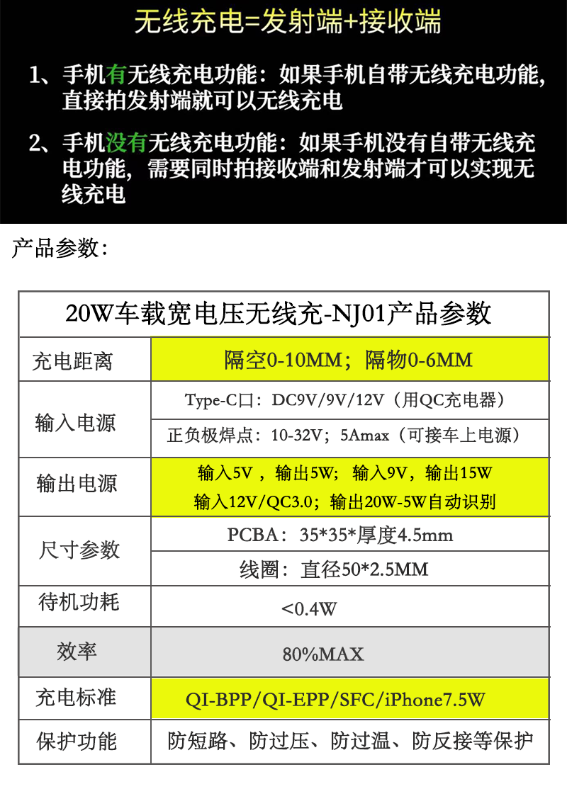 Wireless charger, 20W in-car long-distance wireless charger, wide voltage range from 9V to 30V.